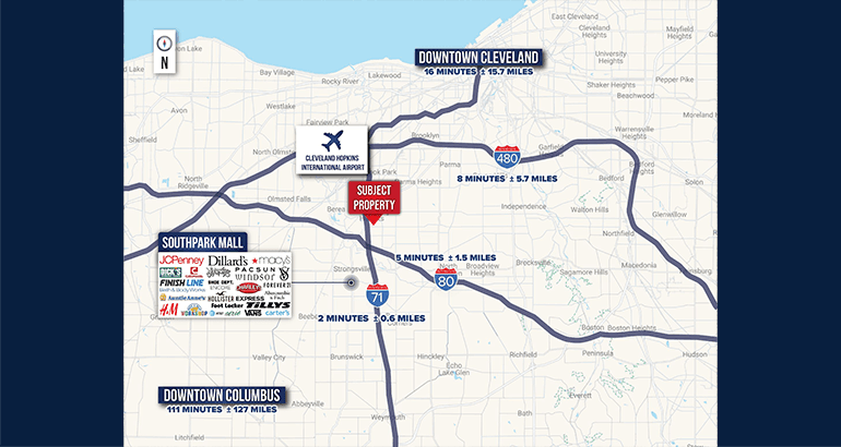 Positioned in close proximity to major retail & business venues such as Southpark Mall, Cleveland Hopkins International Airport, and Dow Circle Business Park