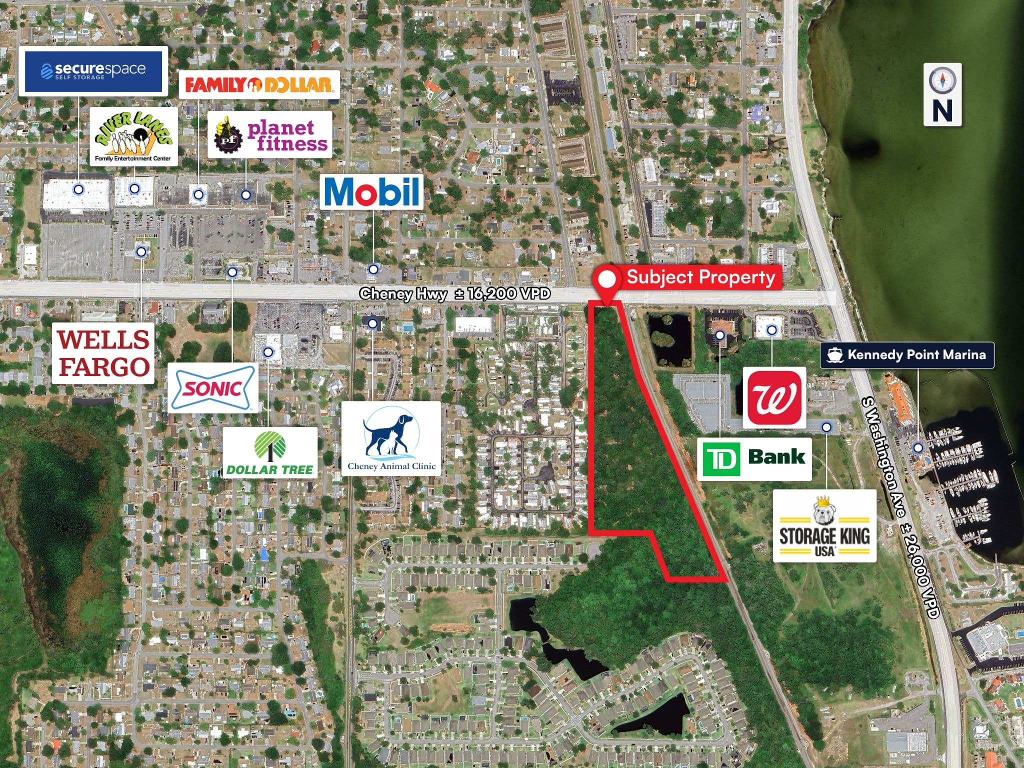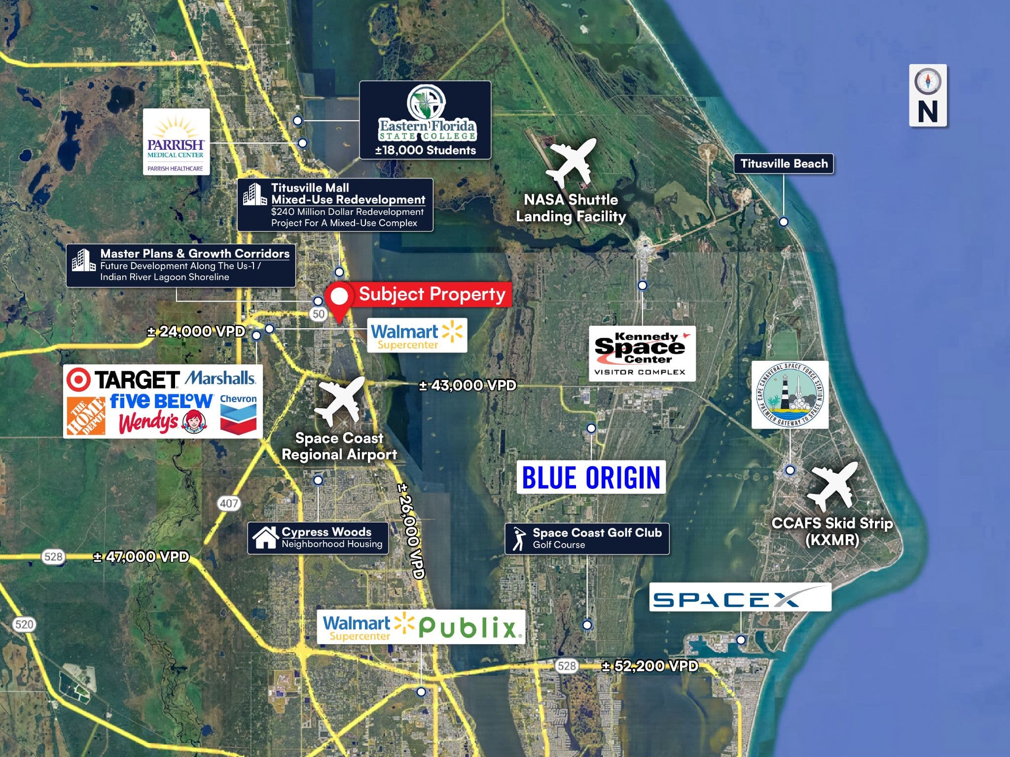 Located along Cheney Highway (State Road 50), a major east-west arterial with high traffic counts, providing direct access to Interstate 95, key commercial areas in Downtown Titusville, and the broader Space Coast employment corridor.
