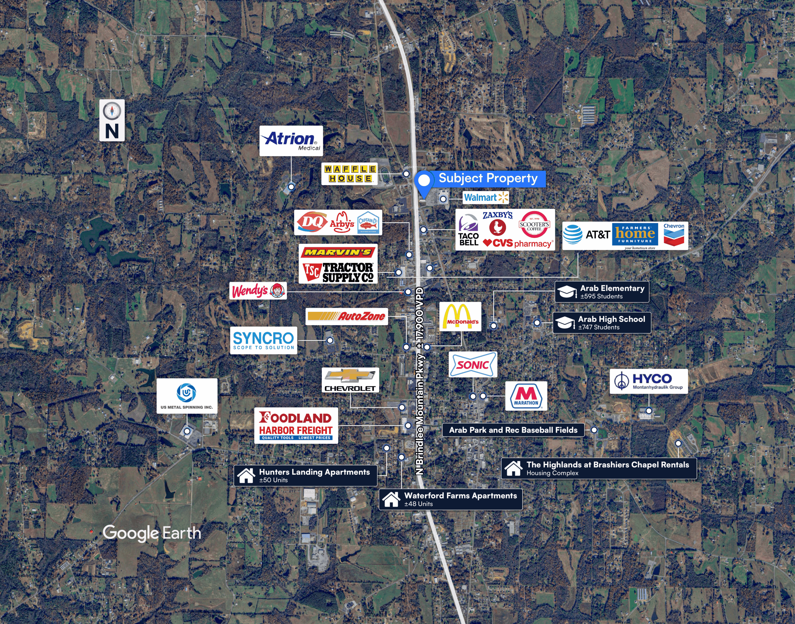 Prime Retail Location | Walmart Outparcel – Strategically positioned along N Brindlee Mountain Parkway, Arab’s primary commercial corridor, offering exceptional visibility to more than ±17,900 vehicles per day. Located directly in front of Walmart, the site benefits from high daily traffic and strong