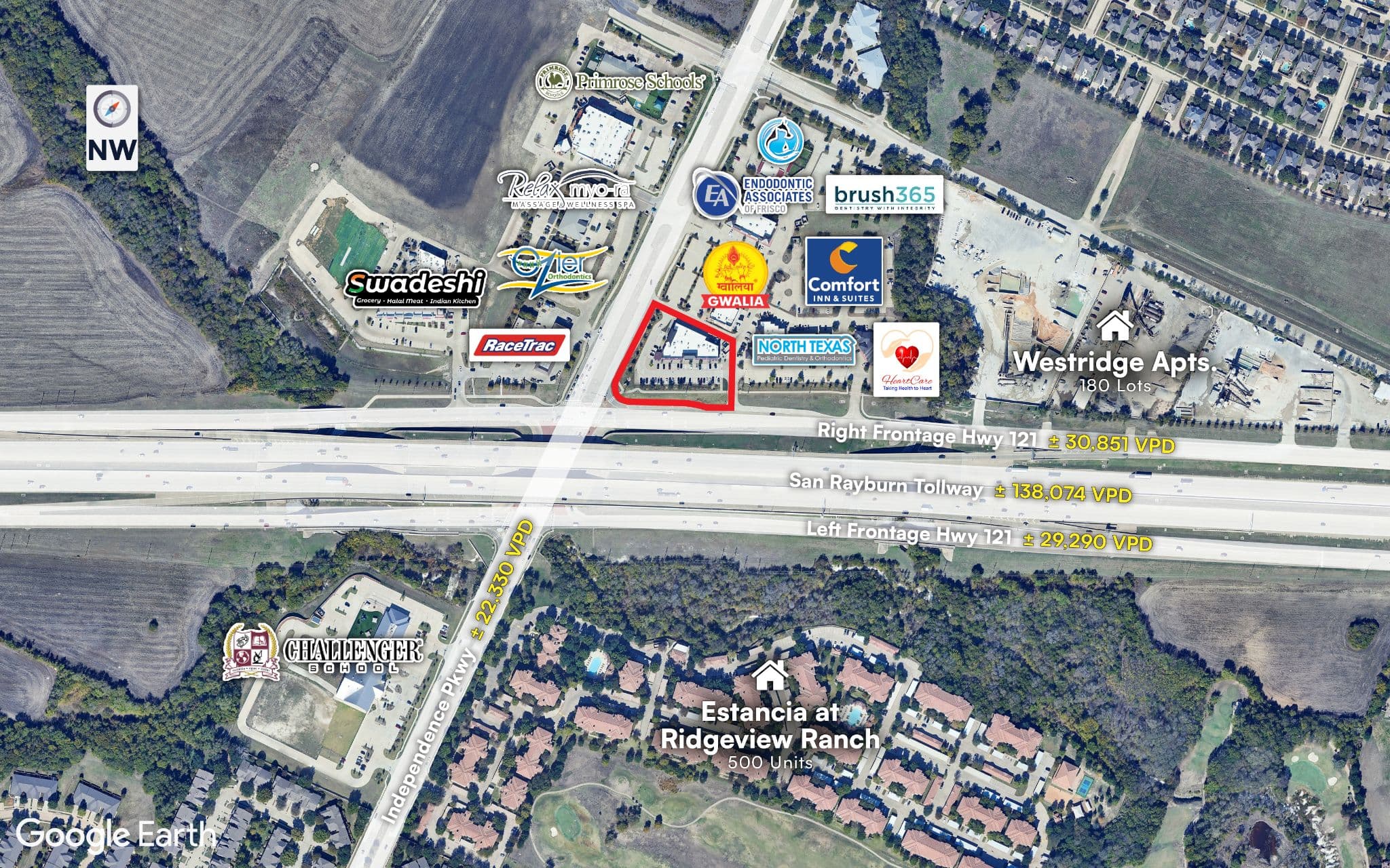 High Visibility & Access: Located just off the Sam Rayburn Tollway (±104,391 VPD) with visibility from SH-121 and Independence Pkwy (±42,700 VPD combined). Multiple ingress/egress points provide convenient access and strong exposure.