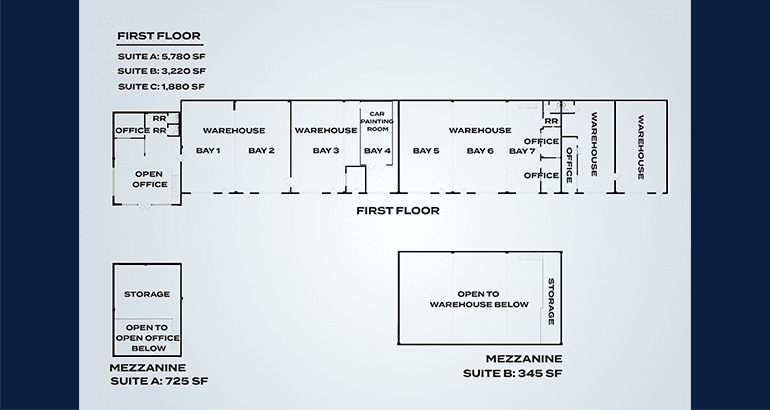 • ±11,950 SF Retail Space featuring roll-up doors, office mezzanine, restrooms, and reception area