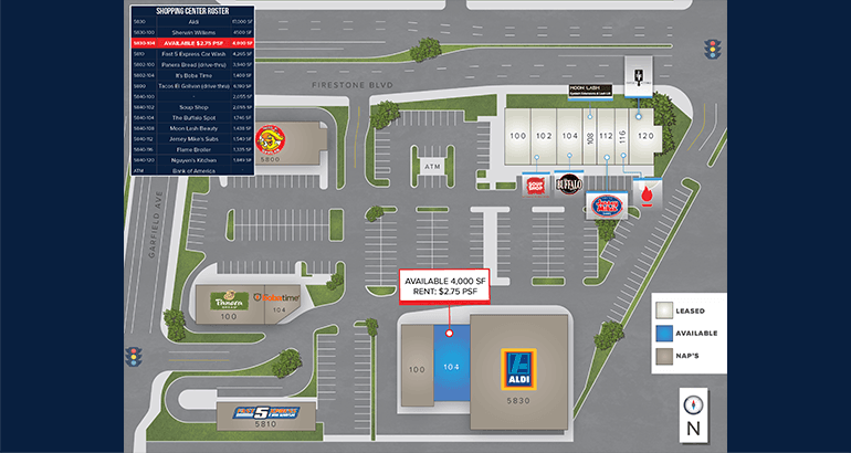 • Dense retail node situated on the signalized intersection of Garfield Ave and Firestone Blvd (±65,000 VPD)