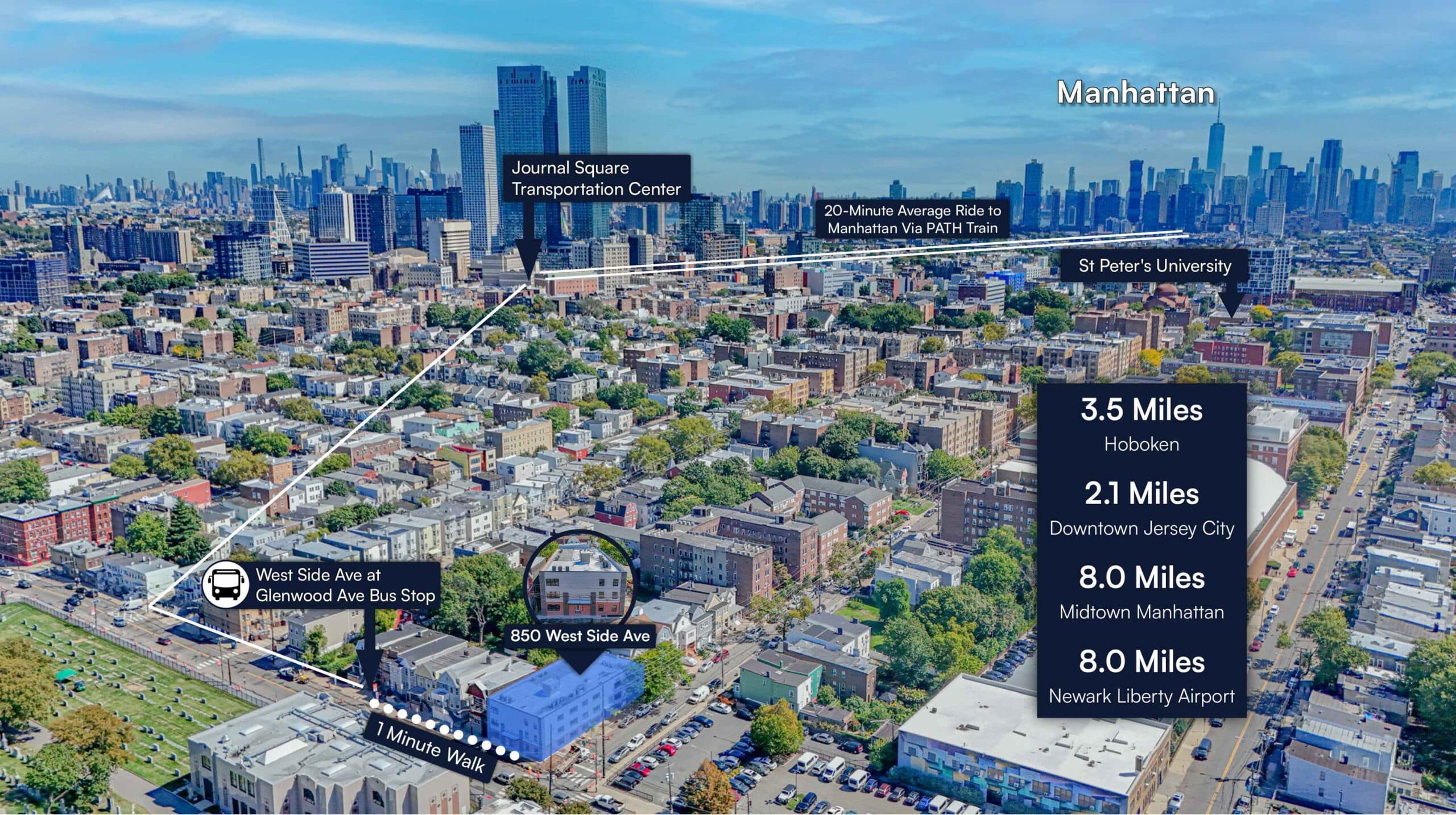 - The building is approximately a 1-minute walk to West Side Ave at Glenwood Ave bus stop which provides a 20 minute trip to Manhattan via the PATH Train.