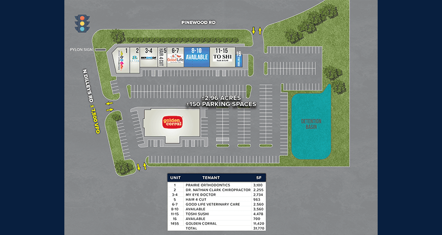 MEDICAL-BASED TENANT MIXThe property features a dynamic tenant line-up with a 15-year average occupancy at the center, including several medical tenants such as an Orthodontist, Chiropractor, MyEyeDr, and GoodLife Veterinary Care.