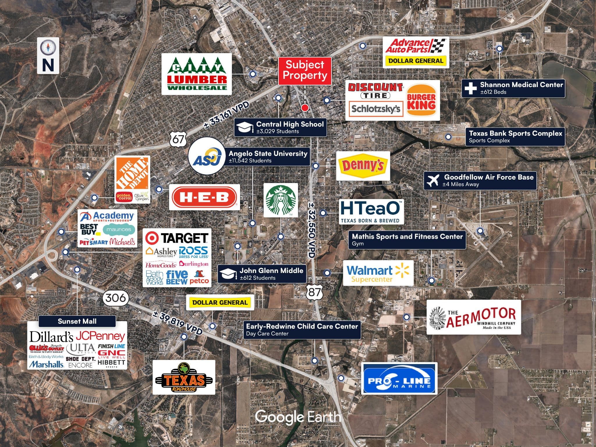 Goodfellow AIr Force Base: Located just 5.5 Miles SE, Goodfellow Air Force Base serves as a joint-service base, supporting a population of over 12,500, including students, permanent party members, civilians, dependents, and retirees.