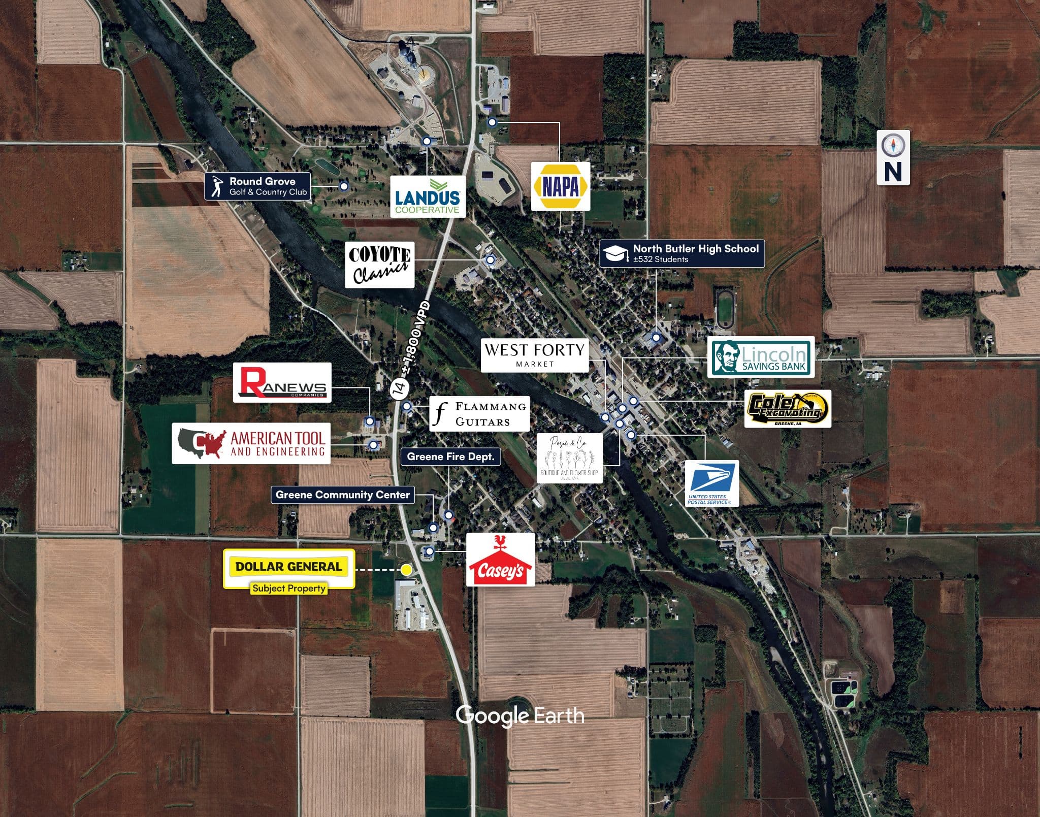 Greene, Iowa, is 40 miles north of the Waterloo–Cedar Falls Twin Cities metropolitan area, which has a population of ± 170,000 residents.