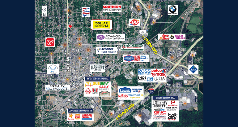 - Great Location – This well populated (near 37,000 people in a 5 mile radius) site is just outside the city center, along 24th Ave, the direct artery into Downtown Meridian and near countless other national retailers.