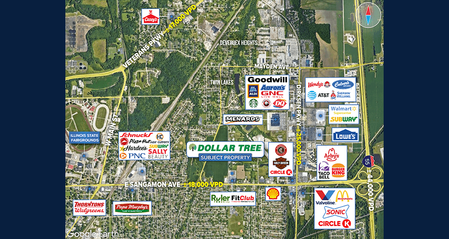 Traffic counts exceed +43,000 at the intersection of Dirksen Pkwy & E Sangamon Rd