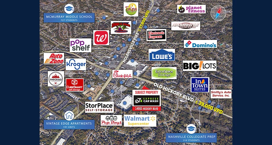 STRATEGIC LOCATION & VISIBILITY: Situated on Old Hickory Blvd with a traffic count of ±39,000 vehicles per day (VPD) with an additional ±37,800 VPD on Nolensville Pike. The car wash also benefits from a highly visible pylon sign and convenient accessibility with center turning lane.