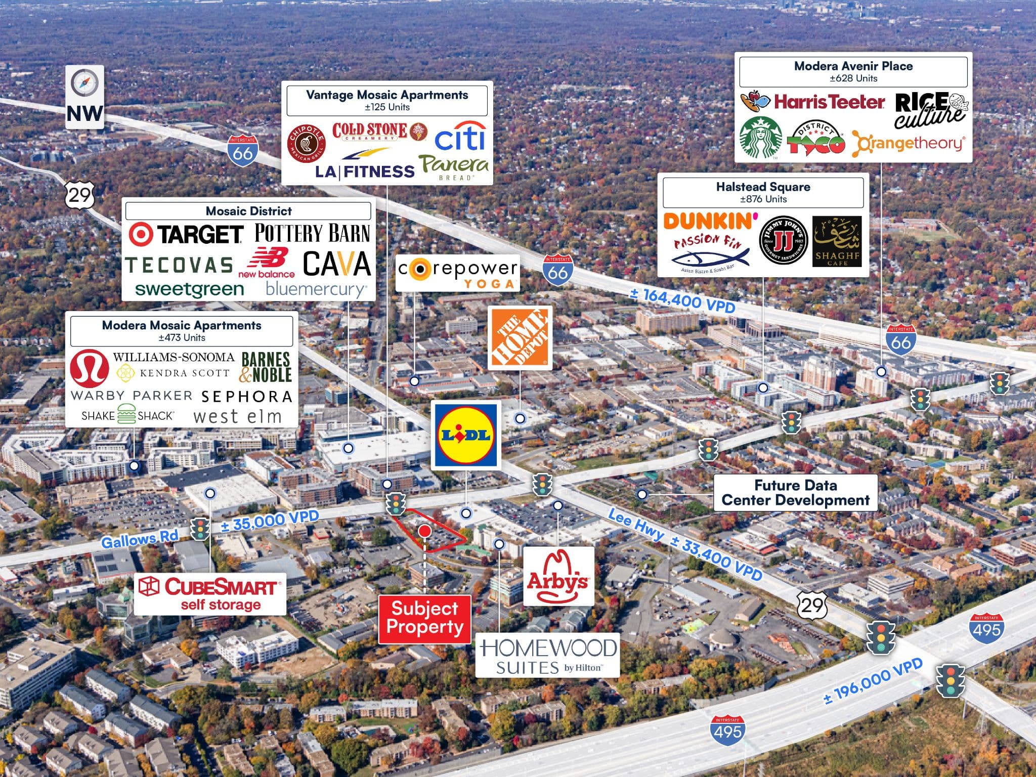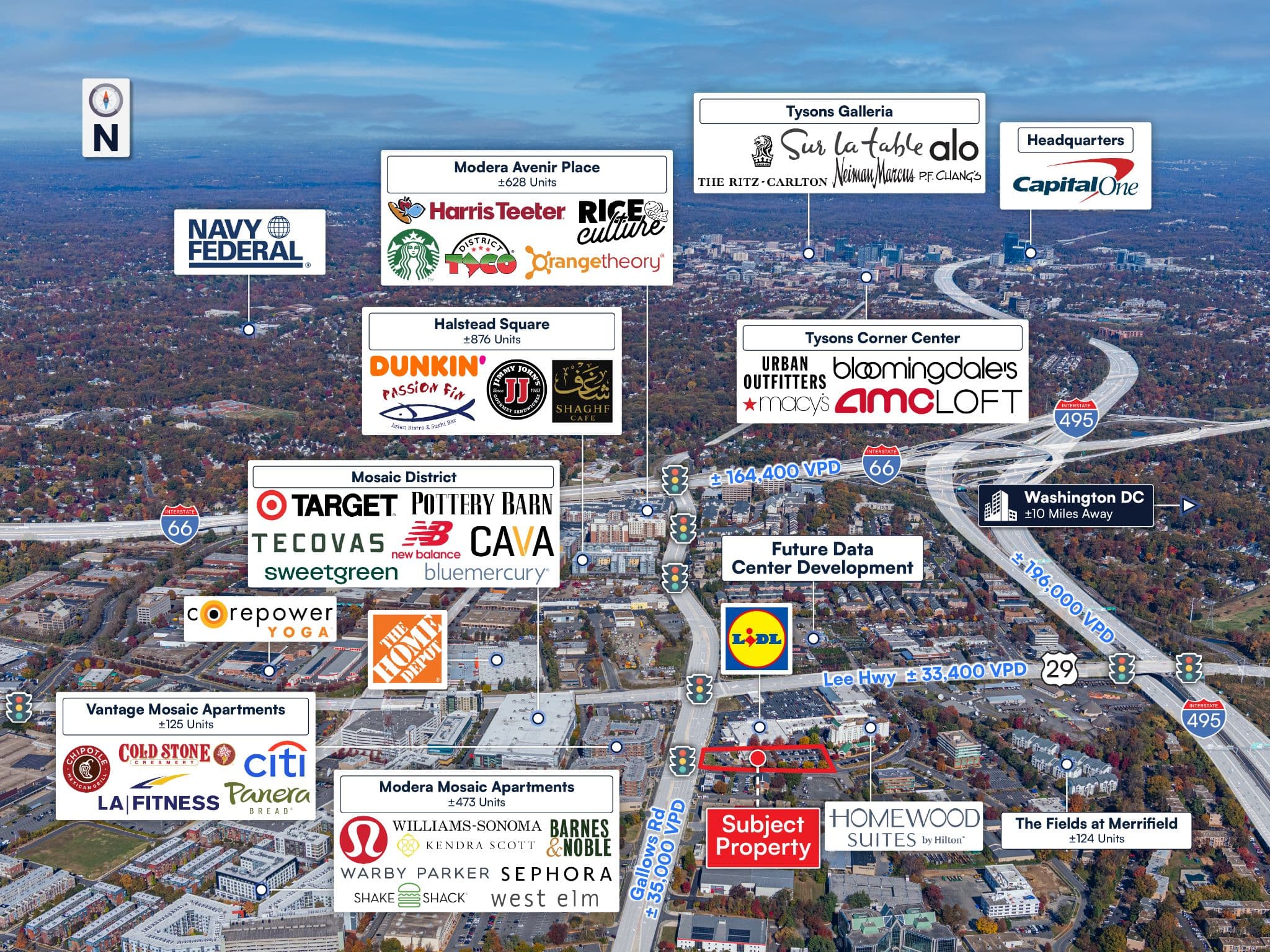 High Traffic and Visibility Northern Virginia Location – Strategically positioned at the signalized intersection of Gallows Road (±35,000 VPD) and Lee Hwy (±33,400 VPD), the property benefits from exceptional visibility and access in a densely populated Washington, D.C. suburb. Regionally traffic is easily accessible from I-66 (±164,400 VPD) and I-495 Capital Beltway (±196,000 VPD). The site is well-situated to capture both commuter and local residential traffic.
