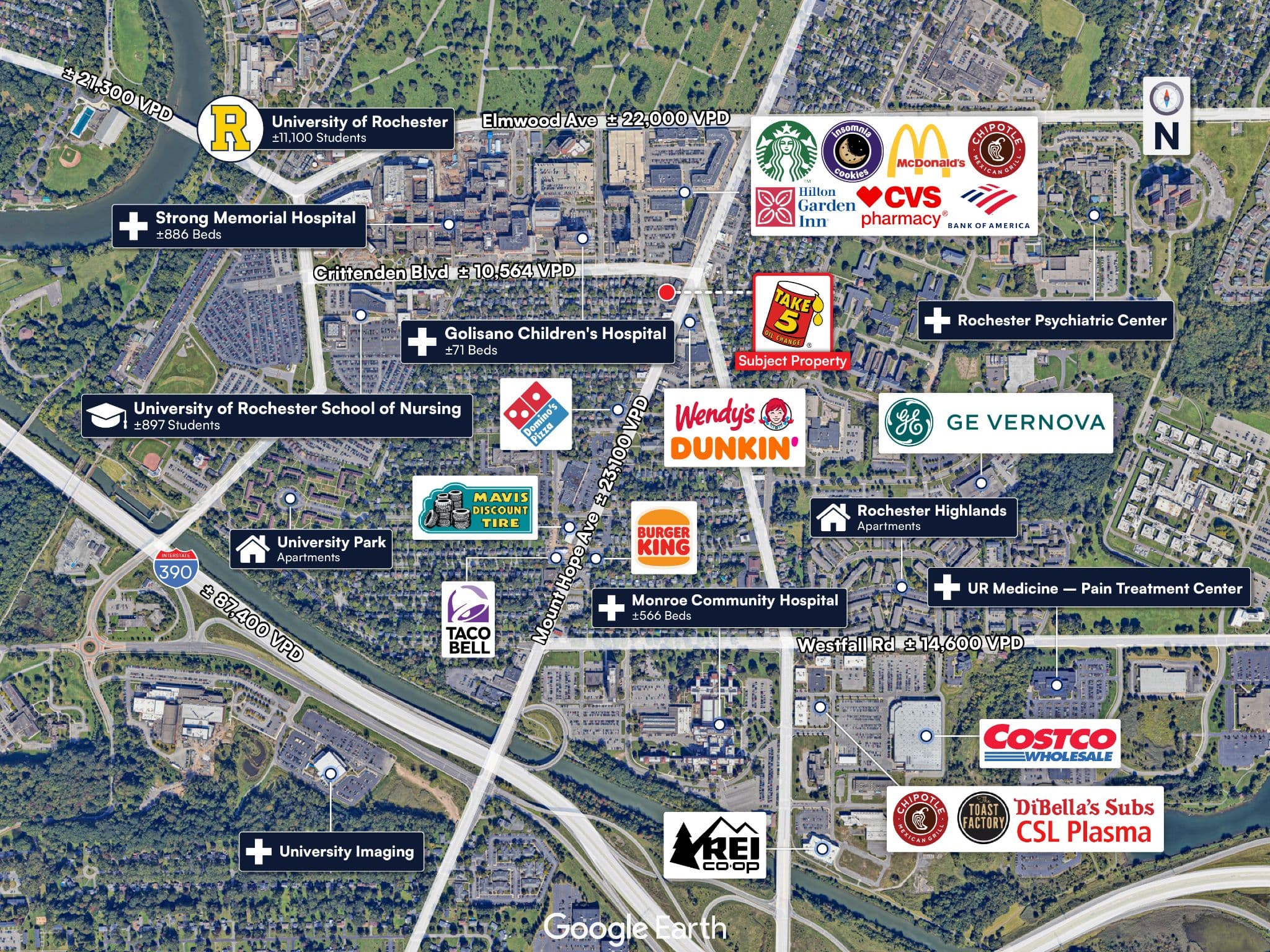 Located at the hard signalized corner of Mt Hope Ave & Crittenden Blvd (±33,664 vehicles daily)