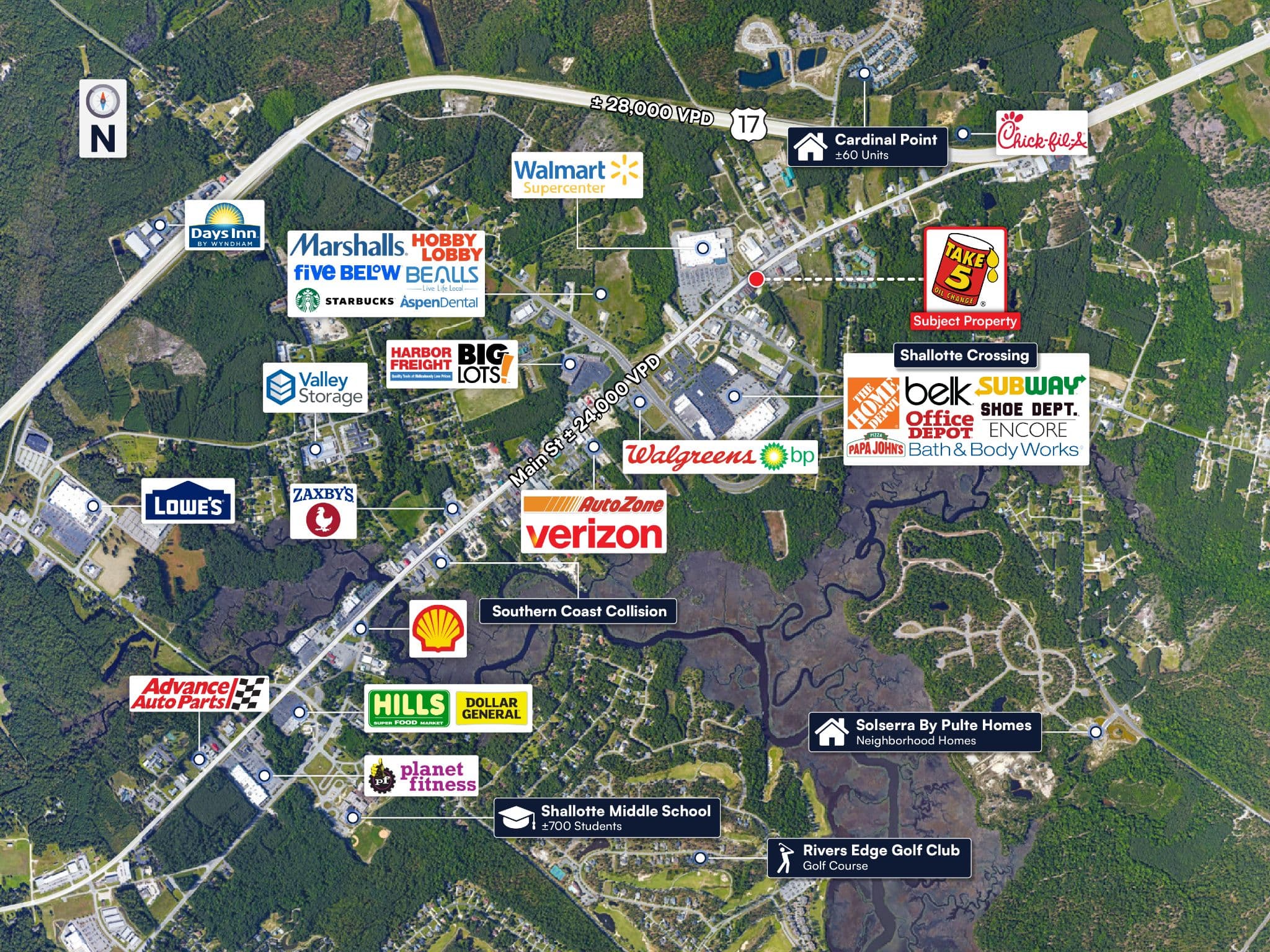Located along Main Street / U.S. 17 Business — a primary commercial corridor in Shallotte, NC, with high daily traffic volumes and excellent visibility