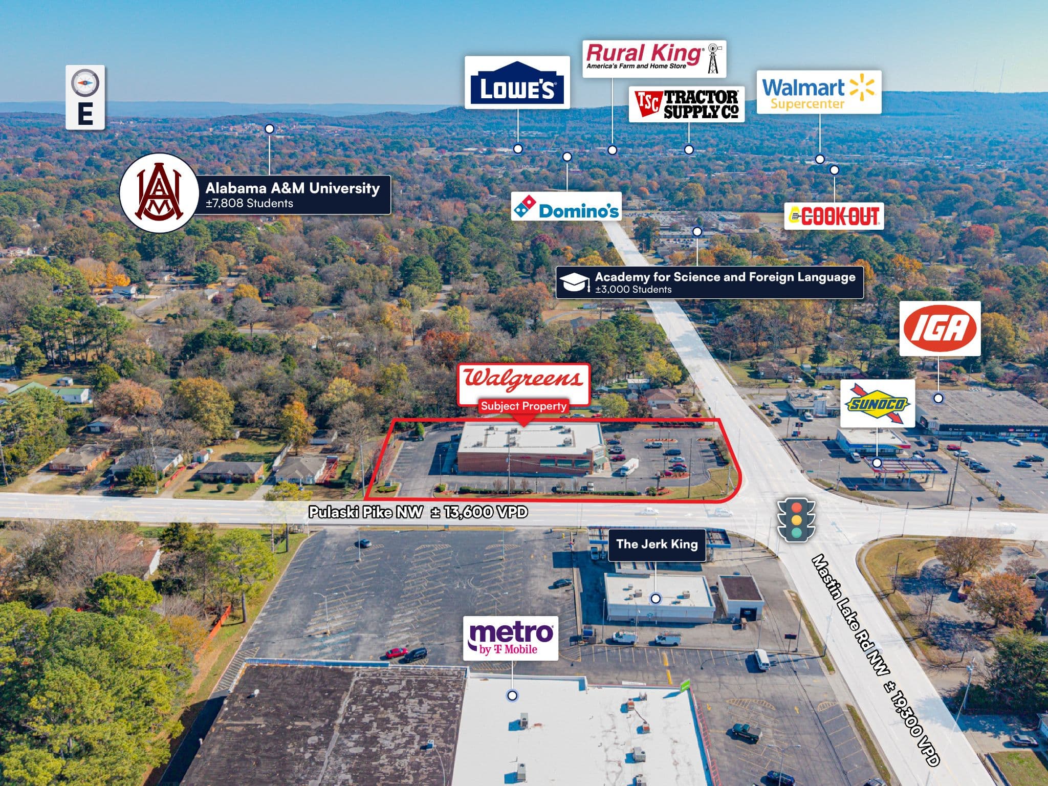 Hard Corner Location with Excellent Visibility and Traffic – Positioned on a hard corner along Mastin Lake Rd, the site benefits from approximately 19,300 vehicles per day (VPD) and direct access to North Memorial Parkway (US-231/431) — a major Huntsville thoroughfare.
