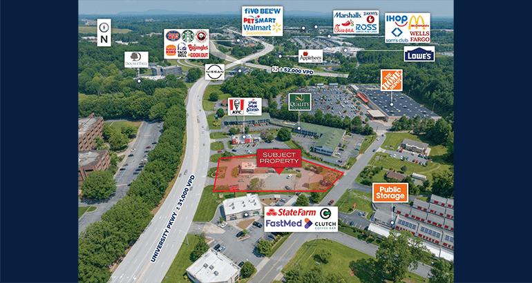 High Traffic Counts – Located on University Parkway (31,000+ VPD) near US-52 (52,000+ VPD).